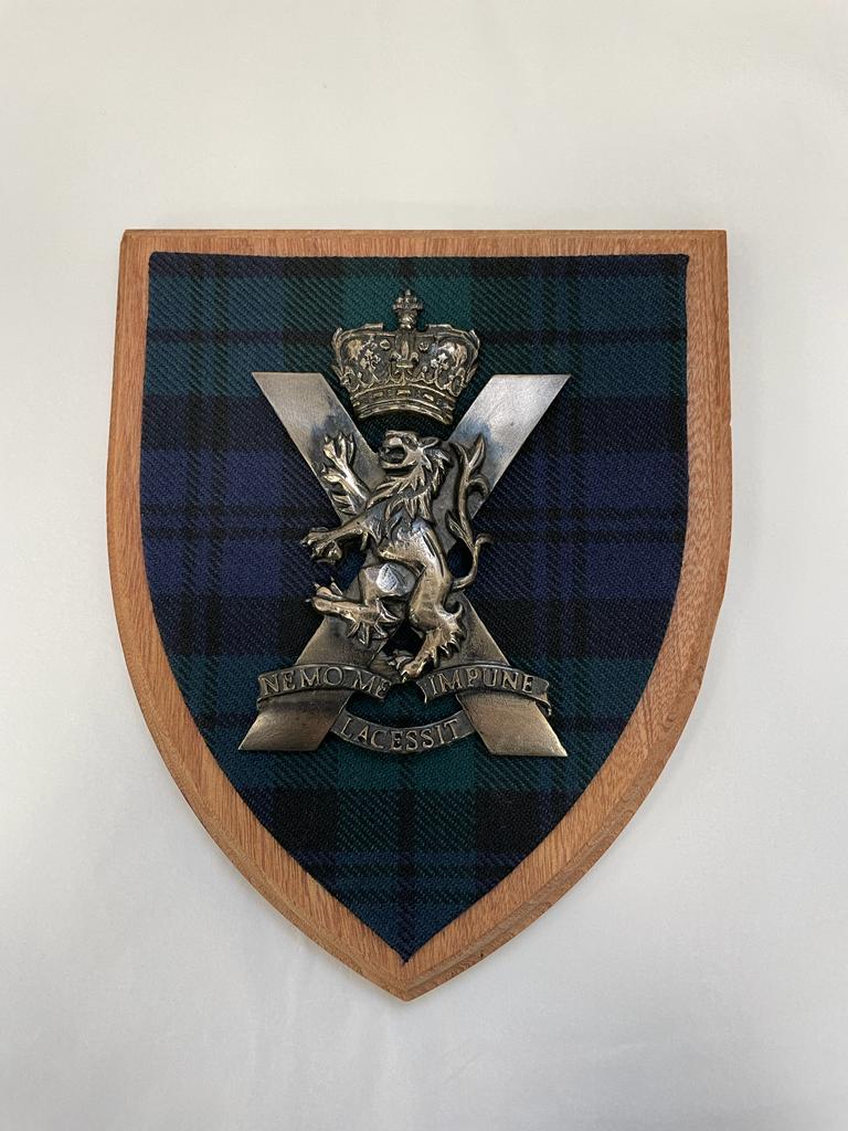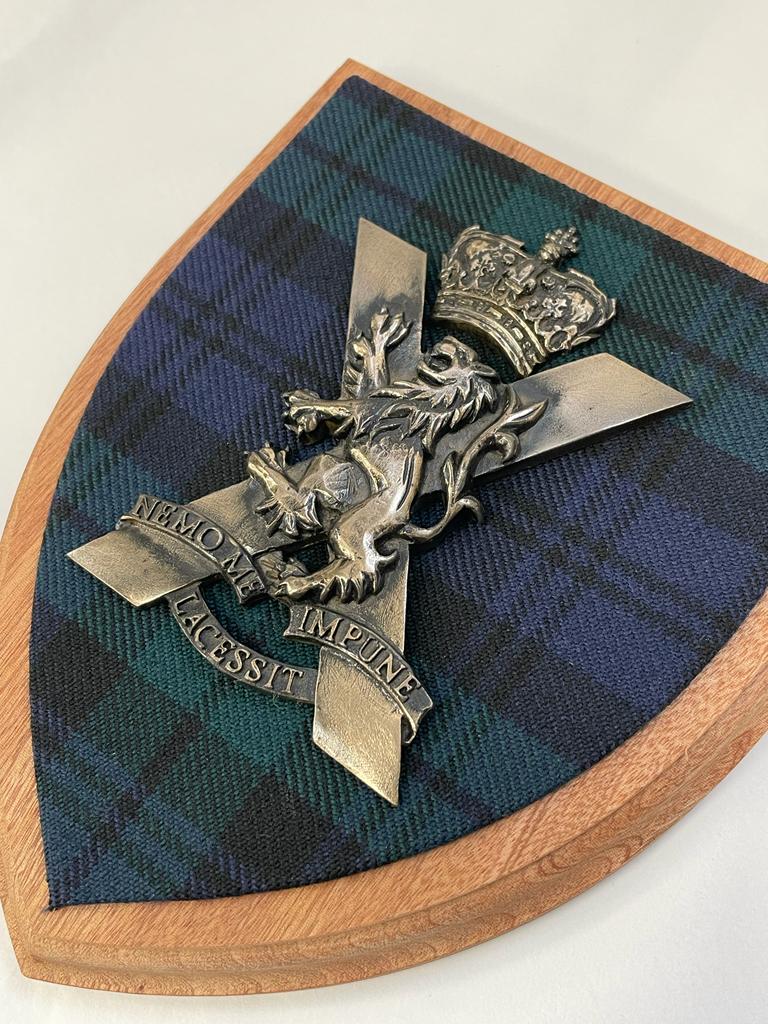 This wonderful SCOTS regimental wall plaque features an expertly crafted cap badge in striking colour, which has been set against a contrasting Government Tartan cloth which all sits on a hardwood shield